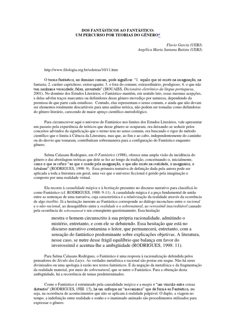 http://www.filologia.org.br/soletras/10/11.htm O termo fantstico, no domnio comum, pode significar: 1. aquilo que s existe na imaginao, na fantasia; 2. carter caprichoso, extravagante; 3. o fora do comum; extraordinrio, prodigioso; 4. o que no tem nenhuma veracidade; falso, inventado (HOUAISS, Dicionrio eletrnico da lngua portuguesa, 2001). No domnio dos Estudos Literrios, o Fantstico mantm, em sentido lato, essas mesmas acepes, e delas advm traos marcantes ou definidores desse gnero movedio por natureza, dependendo da premissa de que parte cada estudioso. Contudo, elas representam o senso comum, e ainda que no devam ser elementos totalmente descartveis para uma anlise terica, no podem ser tomadas como definidoras do gnero literrio, carecendo de maior apreo cientfico-metodolgico. Para circunscrever aqui o universo do Fantstico nos limites dos Estudos Literrios, vale apresentar um passeio pela experincia de tericos que desse gnero se ocuparam, ora deixando-se seduzir pelos conceitos advindos da significao que o termo tem no senso comum, ora buscando o rigor do mtodo cientfico que o limita Cincia da Literatura, mas que, ao fim e ao cabo, independentemente do caminho ou do desvio que tomaram, contriburam sobremaneira para a configurao do Fantstico enquanto gnero. Selma Calasans Rodrigues, em O Fantstico (1988), oferece uma ampla viso da incidncia do gnero e das abordagens tericas que dele se fez ao longo da tradio, conceituando-o, inicialmente, como o que se refere ao que criado pela imaginao, o que no existe na realidade, o imaginrio, o fabuloso (RODRIGUES, 1998: 9). Essa primeira tentativa de definio dada pela autora pode ser aplicada a toda a literatura em geral, uma vez que o universo ficcional gerido pela imaginao e composto por uma realidade virtual. Ela recorre casualidade mgica e hesitao presentes no discurso narrativo para classific-lo como Fantstico (cf. RODRIGUES, 1988: 9-11). A casualidade mgica a pea fundamental de unio entre as sentenas de uma narrativa, cuja caracterstica a relativizao da realidade atravs da ocorrncia de algo inslito. J a hesitao inerente ao Fantstico corresponde ao dilogo inconcluso entre o racional e o no-racional, ao desequilbrio entre a realidade e o sobrenatural, ao verossmil inacreditvel causado pela ocorrncia do sobrenatural e seu conseqente questionamento. Essa hesitao