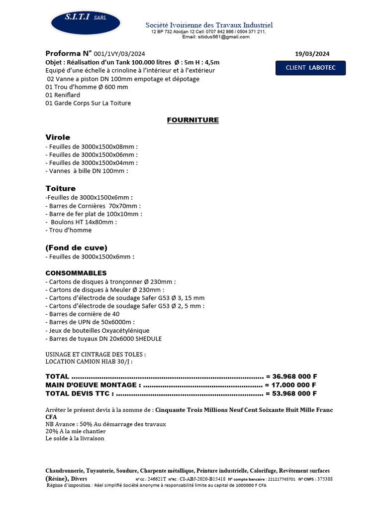 Arrêter le présent devis à la somme de : Cinquante Trois Millions Neuf Cent Soixante Huit Mille Franc