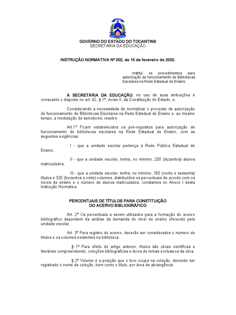 Art. 5º Cada unidade escolar deverá adquirir acervo bibliográfico próprio, observando os percentuais, de acordo com os níveis de ensino a que atende e o Anexo II, desta Instrução Normativa.