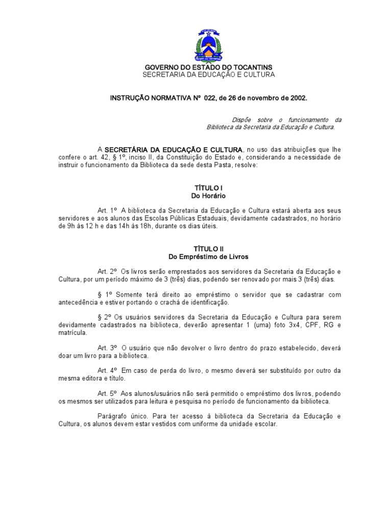 TTULOII DoEmprstimodeLivros Art.2OslivrosseroemprestadosaosservidoresdaSecretariadaEducaoe Cultura,porumperodomximode3(trs)dias,podendoserrenovadopormais3(trs)dias. 1 Somente ter direito ao emprstimo o servidor que se cadastrar com antecednciaeestiverportandoocrachdeidentificao. 2 Os usurios servidores da Secretaria da Educao e Cultura para serem devidamente cadastrados na biblioteca, devero apresentar 1 (uma) foto 3x4, CPF, RG e matrcula. Art.3Ousurioquenodevolverolivrodentrodoprazoestabelecido,dever doarumlivroparaabiblioteca. Art.4Emcasodeperdadolivro,omesmodeversersubstitudoporoutroda mesmaeditoraettulo. Art.5Aosalunos/usuriosnoserpermitidooemprstimodoslivros,podendo osmesmosserutilizadosparaleituraepesquisanoperododefuncionamentodabiblioteca. Pargrafo nico. Para ter acesso biblioteca da Secretaria da Educao e Cultura,osalunosdevemestarvestidoscomuniformedaunidadeescolar.