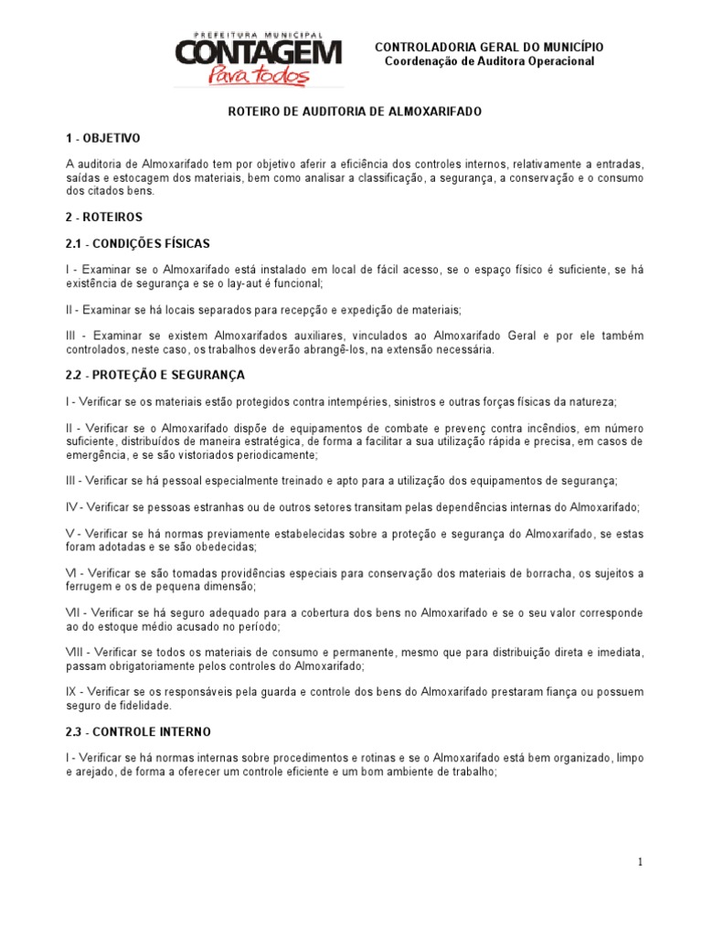 ROTEIRO DE AUDITORIA DE ALMOXARIFADO 1 - OBJETIVO A auditoria de Almoxarifado tem por objetivo aferir a eficincia dos controles internos, relativamente a entradas, sadas e estocagem dos materiais, bem como analisar a classificao, a segurana, a conservao e o consumo dos citados bens. 2 - ROTEIROS 2.1 - CONDIES FSICAS I - Examinar se o Almoxarifado est instalado em local de fcil acesso, se o espao fsico suficiente, se h existncia de segurana e se o lay-aut funcional; II - Examinar se h locais separados para recepo e expedio de materiais; III - Examinar se existem Almoxarifados auxiliares, vinculados ao Almoxarifado Geral e por ele tambm controlados, neste caso, os trabalhos devero abrang-los, na extenso necessria. 2.2 - PROTEO E SEGURANA I - Verificar se os materiais esto protegidos contra intempries, sinistros e outras foras fsicas da natureza; II - Verificar se o Almoxarifado dispe de equipamentos de combate e preven contra incndios, em nmero suficiente, distribudos de maneira estratgica, de forma a facilitar a sua utilizao rpida e precisa, em casos de emergncia, e se so vistoriados periodicamente; III - Verificar se h pessoal especialmente treinado e apto para a utilizao dos equipamentos de segurana; IV - Verificar se pessoas estranhas ou de outros setores transitam pelas dependncias internas do Almoxarifado; V - Verificar se h normas previamente estabelecidas sobre a proteo e segurana do Almoxarifado, se estas foram adotadas e se so obedecidas; VI - Verificar se so tomadas providncias especiais para conservao dos materiais de borracha, os sujeitos a ferrugem e os de pequena dimenso; VII - Verificar se h seguro adequado para a cobertura dos bens no Almoxarifado e se o seu valor corresponde ao do estoque mdio acusado no perodo; VIII - Verificar se todos os materiais de consumo e permanente, mesmo que para distribuio direta e imediata, passam obrigatoriamente pelos controles do Almoxarifado; IX - Verificar se os responsveis pela guarda e controle dos bens do Almoxarifado prestaram fiana ou possuem seguro de fidelidade. 2.3 - CONTROLE INTERNO I - Verificar se h normas internas sobre procedimentos e rotinas e se o Almoxarifado est bem organizado, limpo e arejado, de forma a oferecer um controle eficiente e um bom ambiente de trabalho;