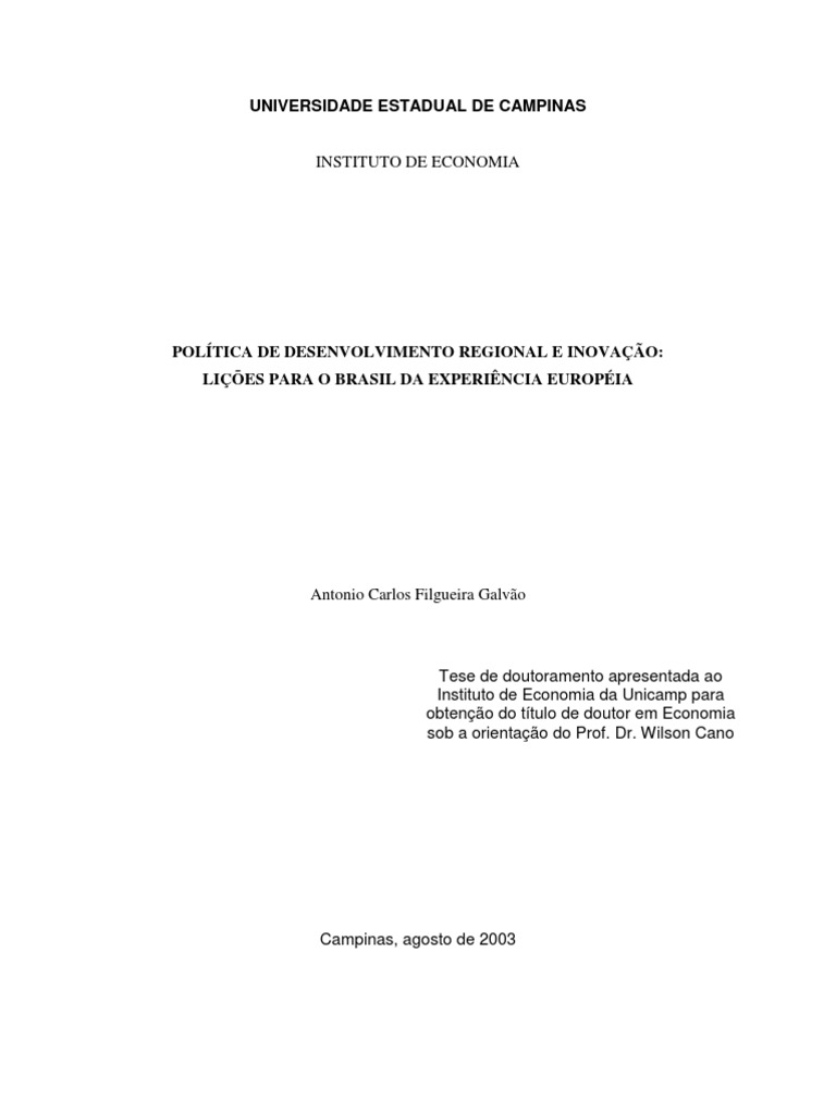 No IE/Unicamp pude assenhorar-me da valiosa colaboração do Professor Wilson Cano, meu orientador, cuja dedicação, confiança e estímulo permanentes muito contribuíram para que o resultado do esforço chegasse a bom termo. A liderança histórica do Professor Cano no debate regional transformou-se em um estímulo a mais para o exercício de uma salutar verificação e confrontação de idéias, sempre tendo por pano de fundo os interesses maiores do desenvolvimento brasileiro. Ao seu lado, os demais professores da área ajudaram a construir um ambiente denso e profícuo de reflexão. Destaco aqui, como exemplo, a satisfação de ter tratado de temas como o Federalismo e o Estado, que perderam visível espaço nas grades curriculares recentes dos cursos de pós-graduação em economia.