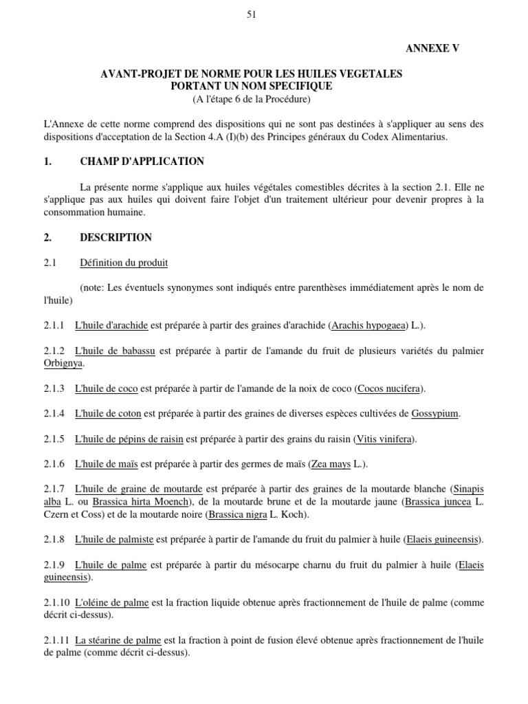 AVANT-PROJET DE NORME POUR LES HUILES VEGETALES