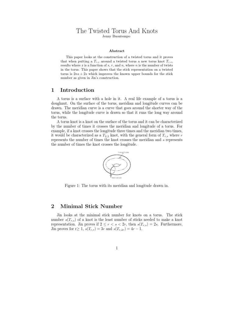 By having an even i, Xi Xi +1 is rotated through the angle, ri/s (/2) on the z-axis. This rotation causes the points (cos(/2), sin(/2), 1) and (cos(/2), sin(/2), 1) to be connected by the line segment. This line segment is contained in H . The same technique can be applied to the line segment Xi Xi1 , while rotating it through the angle, ri/s (/2) (radians) on the z-axis. This line segment is contained in H . Each curve goes around the z axis through 2r/s (radians), so a knot goes r times around the longitude. Then Jin considers a disc whose core is the union of H and H . The curve that Jin denes causes the linking number of the knot to be s, meaning that he has constructed Tr,s with 2s edges. 2