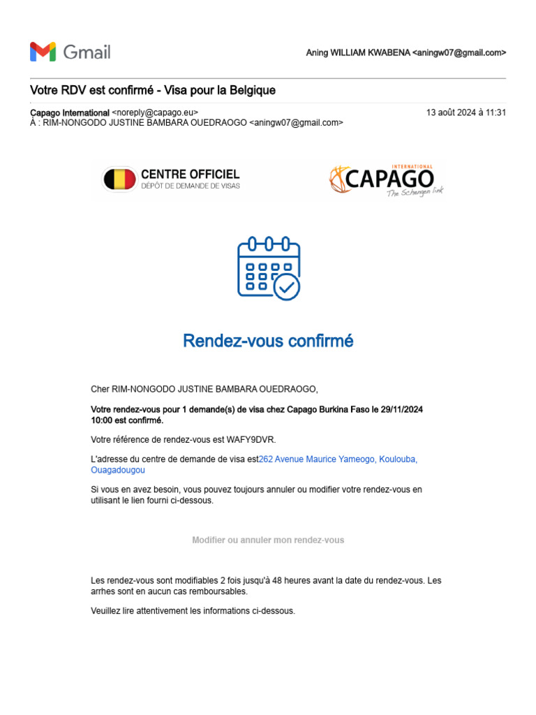 Votre RDV est confirmé - Visa pour la Belgique