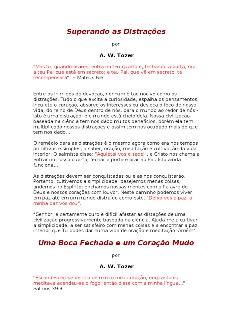 "Mas tu, quando orares, entra no teu quarto e, fechando a porta, ora a teu Pai que est em secreto; e teu Pai, que v em secreto, te recompensar". -- Mateus 6:6 Entre os inimigos da devoo, nenhum to nocivo como as distraes. Tudo o que excita a curiosidade, espalha os pensamentos, inquieta o corao, absorve os interesses ou desloca o foco de nossa vida, do reino de Deus dentro de ns, para o mundo ao redor de ns isto uma distrao; e o mundo est cheio dela. Nossa civilizao baseada na cincia tem nos dado muitos benefcios, porm ela tem multiplicado nossas distraes e assim tem nos ocupado mais do que tem nos dado... O remdio para as distraes o mesmo agora como era nos tempos primitivos e simples, a saber, orao, meditao e cultivao da vida interior. O salmista disse: "Aquietai-vos e sabei", e Cristo nos chama a entrar no nosso quarto, fechar a porta e orar ao Pai. Isto ainda funciona... As distraes devem ser conquistadas ou elas nos conquistaro. Portanto, cultivemos a simplicidade; desejemos menas coisas; andemos no Esprito; enchamos nossas mentes com a Palavra de Deus e nossos coraes com louvor. Neste caminho podemos viver em paz at em um mundo distrado como este. "Deixo-vos a paz, a minha paz vos dou". Senhor, certamente duro e difcil afastar as distaes de uma civilizao progressivamente baseada na cincia. Ajuda-me a cultivar a simplicidade, a ser satisfeiro com menas coisas e a encontrar a paz interior que Tu podes dar numa vida de orao e meditao. Amm