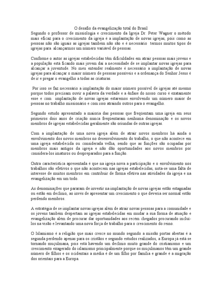 Peter Wagner o mtodo mais eficaz para o crescimento da igreja a implantao de novas igrejas, pois como as pessoas no so iguais as igrejas tambm no so e necessrio termos muitos tipos de igrejas para alcanarmos um nmero varivel de pessoas. Conforme o autor as igrejas estabelecidas tm dificuldades em atrair pessoas mais jovens e a populao est ficando mais jovem da a necessidade de se implantar novas igrejas para alcanar a juventude. No meu entender realmente necessrio a implantao de novas igrejas para alcanar o maior nmero de pessoas possveis e a ordenana do Senhor Jesus de ir e pregar o evangelho a todas as criaturas. Por isso se faz necessrio a implantao do maior nmero possvel de igrejas at mesmo porque todos precisam ouvir a palavra da verdade e a nfase do nosso curso exatamente esse e com implantao de novas igrejas estaremos envolvendo um nmero maior de pessoas no trabalho missionrio e com isso atraindo outros para o evangelho. Segundo estudo apresentado a maioria das pessoas que freqentam uma igreja em seus primeiros dois anos de criao nunca freqentaram nenhuma denominao e os novos membros de igrejas estabelecidas geralmente so oriundas de outras igrejas. Com a implantao de uma nova igreja alm de atrair novos membros h ainda o envolvimento dos novos membros no desenvolvimento do trabalho, o que no acontece em uma igreja estabelecida ou considerada velha, sendo que as funes so ocupadas por membros mais antigos da igreja e no do oportunidades aos novos membros por considera-los imaturos ou despreparados para a funo. Outra caracterstica apresentada que na igreja nova a participao e o envolvimento nos trabalhos so efetivos o que no acontecem nas igrejas estabelecidas, nota-se uma falta de interesse de muitos membros em contribuir de forma efetiva nas atividades da igreja e na evangelizao em um todo. As denominaes que pararam de investir na implantao de novas igrejas esto estagnadas ou esto em declnio, ao invs de apresentar um crescimento o que deveria ser normal esto perdendo membros. A estratgia de se implantar novas igrejas alm de atrair novas pessoas para a comunidade e os jovens tambm despertam as igrejas estabelecidas em mudar a sua forma de atuao e evangelizao alm de procurar dar oportunidades aos recm chegados procurando inclulos na viso e levantando uma nova fora de trabalho para o crescimento do reino. O Islamismo a religio que mais cresce no mundo segundo a misso portas abertas a segunda perdendo apenas para os cristos e segundo estudos realizados, a Europa j est se tornando muulmana, pois est havendo um declnio muito grande do cristianismo e um crescimento exagerado do islamismo principalmente porque os muulmanos tm um grande nmero de filhos e os ocidentais a mdia de um filho por famlia e grande a migrao dos orientais para a Europa.