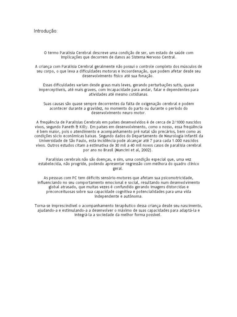O termo Paralisia Cerebral descreve uma condio de ser, um estado de sade com implicaes que decorrem de danos ao Sistema Nervoso Central. A criana com Paralisia Cerebral geralmente no possui o controle completo dos msculos de seu corpo, o que leva a dificuldades motoras e incoordenao, que podem afetar desde seu desenvolvimento fsico at sua fonao. Essas dificuldades variam desde graus mais leves, gerando perturbaes sutis, quase imperceptveis, at mais graves, com incapacidade para andar, falar e dependentes para atividades at mesmo cotidianas. Suas causas so quase sempre decorrentes da falta de oxigenao cerebral e podem acontecer durante a gravidez, no momento do parto ou durante o perodo do desenvolvimento neuro motor. A freqncia de Paralisias Cerebrais em pases desenvolvidos de cerca de 2/1000 nascidos vivos, segundo Paneth & Killy. Em pases em desenvolvimento, como o nosso, essa freqncia bem maior, pois o atendimento e acompanhamento pr natal so precrios, bem como as condies scio econmicas baixas. Segundo dados do Departamento de Neurologia Infantil da Universidade de So Paulo, esta incidncia pode alcanar at 7 para cada 1.000 nascidos vivos. Outros estudos citam a estimativa de 30 mil a 40 mil novos casos de paralisia cerebral por ano no Brasil (Mancini et al, 2002). Paralisias cerebrais no so doenas, e sim, uma condio especial que, uma vez estabelecida, no progride, podendo apresentar regresso com melhora do quadro clnico geral. As pessoas com PC tem dficits sensrio-motores que afetam sua psicomotricidade, influenciando no seu comportamento emocional e social, resultando num desenvolvimento global atrasado, que muitas vezes confundido gerando imagens distorcidas e preconceituosas sobre sua capacidade cognitiva e potencialidades para uma vida independente e autnoma. Torna-se imprescindvel o acompanhamento teraputico dessa criana desde seu nascimento, ajudando-a e estimulando-a a desenvolver o mximo de suas capacidades para adapt-la e integr-la a sociedade da melhor forma possvel.