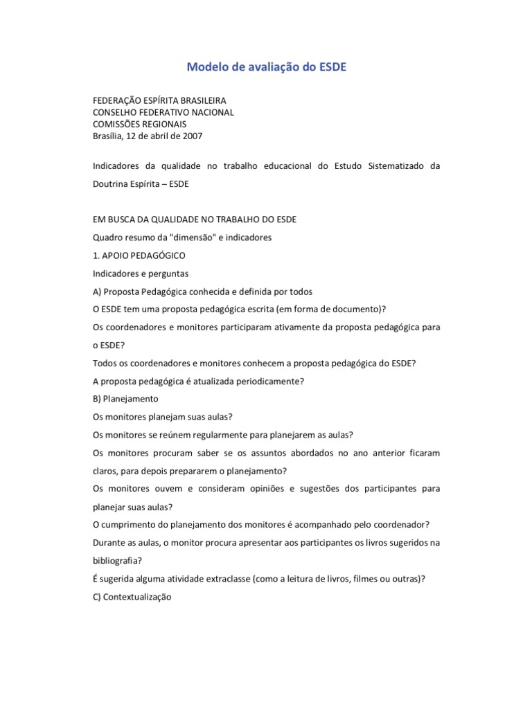 sem distinção. recebam a mesma atenção? CONSENSO: _______________________________________________________________________ _______________________________________________________ 2. encontra pessoas dispostas a ajudá-lo? O ambiente da Casa Espírita favorece a amizade entre todos (coordenadores. AMBIENTE ACOLHEDOR Indicadores e perguntas A) Amizade e solidariedade Quando o participante chega à Casa Espírita com algum problema pessoal. respeita-se o fato de que cada participante precisa de um tempo diferente para aprender? O coordenador / monitor cuida para que todos. monitores.Participantes com deficiência recebem apoio individualizado na sala de aula? Na sala de aula. participantes e demais trabalhadores da Casa)? Existe um esforço por parte da Casa Espírita no sentido de demonstrar aos participantes de ESDE que eles são muito importantes no contexto das atividades da Casa? Os laços de amizade entre os participantes. coordenadores e monitores são suficientemente trabalhados. de modo que diminua o índice de evasão? CONSENSO: _______________________________________________________________________ ______________________________________________________ B) Alegria e motivação Os participantes do ESDE gostam de freqüentar a Casa Espírita? As pessoas que trabalham na Casa Espírita gostam das atividades que fazem? .