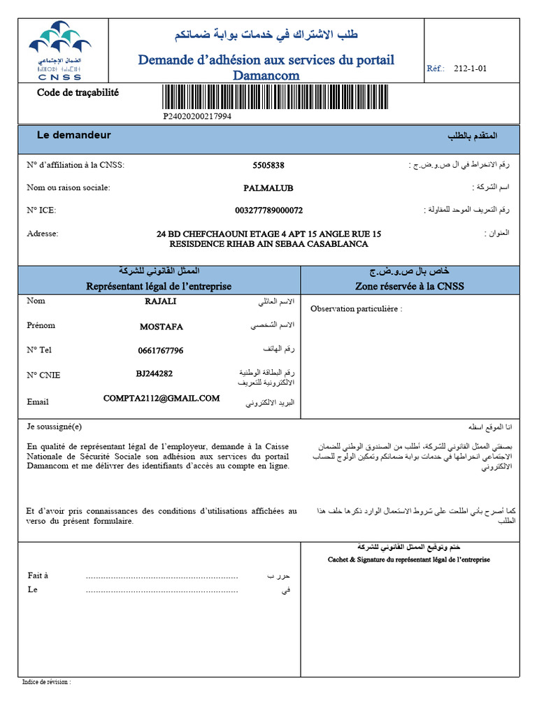 N° d’affiliation à la CNSS: 5505838 : ﺝ.ﺽ.ﻭ.ﺭﻗﻢ ﺍﻻﻧﺨﺮﺍﻁ ﻓﻲ ﺍﻝ ﺹ