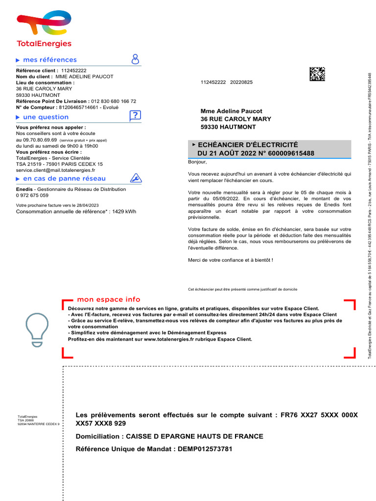 TotalEnergies Les prélèvements seront effectués sur le compte suivant : FR76 XX27 5XXX 000X