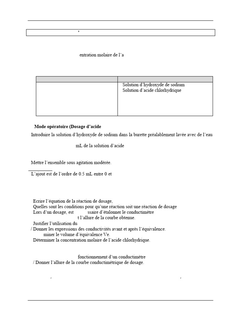 2. Mode opératoire (Dosage d’acide chlorhydrique) :