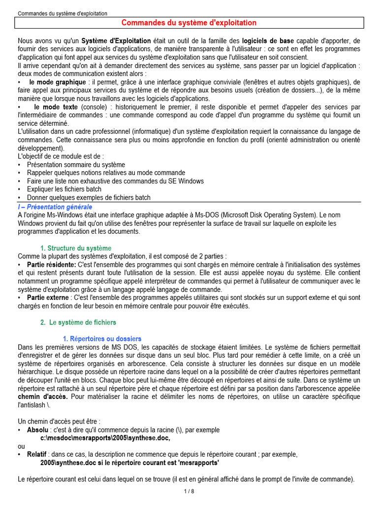 l'utilisation des commandes du SE Windows. Les commandes peuvent varier selon la version du système d'exploitation, il