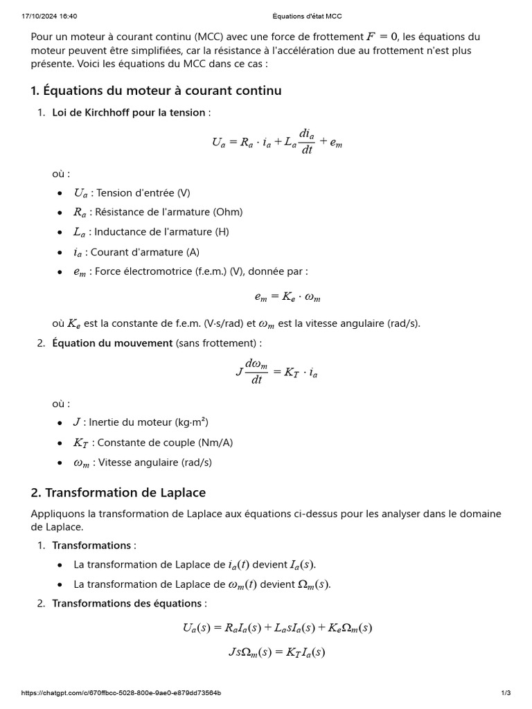 Pour un moteur à courant continu (MCC) avec une force de frottement F = 0, les équations du