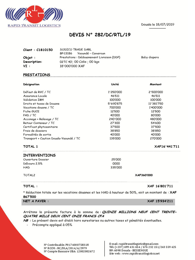 NB : Le présent devis est établi hors surestaries ou autres taxes et pénalités éventuelles.