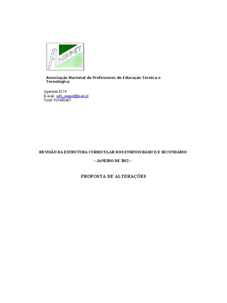 Consideraes finais Constando do presente documento, devidamente fundamentadas, quer do ponto de vista cientfico, quer pedaggico-didctico todas as opes enunciadas nas nossas propostas, no estrito interesse dos alunos, sujeitos essenciais da actividade educativa, julgamos ter dado, por ora, o nosso contributo para a sua educao e formao integrais. No se encontrando, todavia, esgotadas outras possibilidades de enriquecimento curricular, colocamo-nos, desde j, inteira disposio do Ministrio da Educao, bem como de outros parceiros, para o eventual aprofundamento das opes aqui tomadas por esta associao nacional de professores, esperando estar a contribuir para a melhoria do Sistema Educativo e para a necessria promoo da qualificao dos portugueses da qual depender, sem sombra de dvidas, um desenvolvimento econmico-social mais harmonioso que, por sua vez, d resposta aos graves constrangimentos que nos separam dos nossos parceiros europeus, entre outros, cujas apostas educativas j colheram melhores frutos. Pela Direco Nacional da A.N.A.P.E.T. (Associao Nacional de Professores de Educao Tcnica e Tecnolgica)
