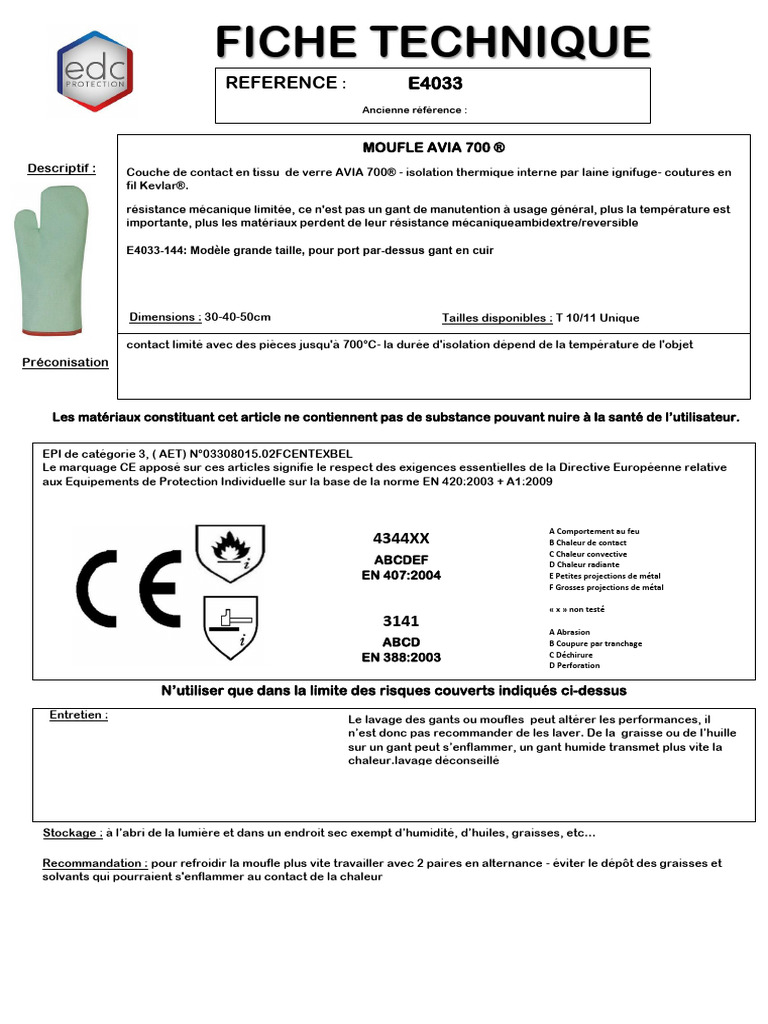 EPI de catégorie 3, ( AET) N°03308015.02FCENTEXBEL