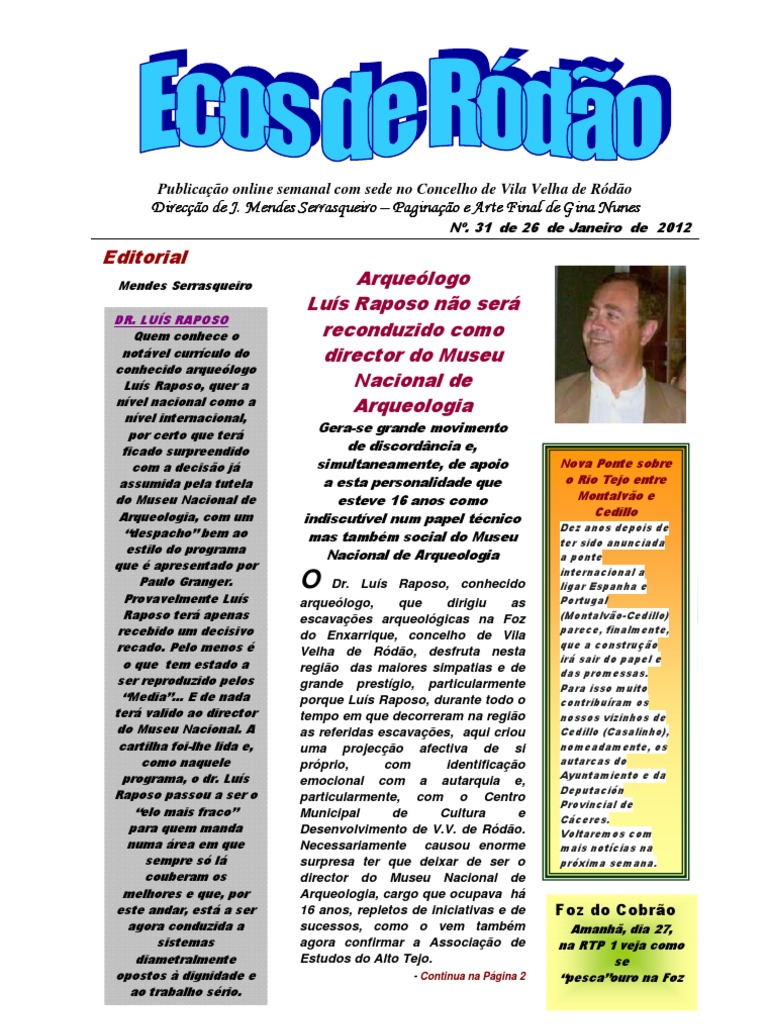 Dr. Lus Raposo, conhecido arquelogo, que dirigiu as escavaes arqueolgicas na Foz do Enxarrique, concelho de Vila Velha de Rdo, desfruta nesta regio das maiores simpatias e de grande prestgio, particularmente porque Lus Raposo, durante todo o tempo em que decorreram na regio as referidas escavaes, aqui criou uma projeco afectiva de si prprio, com identificao emocional com a autarquia e, particularmente, com o Centro Municipal de Cultura e Desenvolvimento de V.V. de Rdo. Necessariamente causou enorme surpresa ter que deixar de ser o director do Museu Nacional de Arqueologia, cargo que ocupava h 16 anos, repletos de iniciativas e de sucessos, como o vem tambm agora confirmar a Associao de Estudos do Alto Tejo.