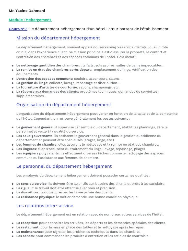 Cours n°2 : Le département hébergement d'un hôtel : cœur battant de l'établissement