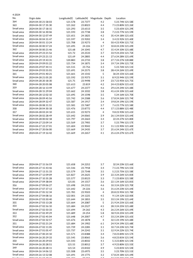 364 2024-04-30 [Link] 121.578 23.7377 4.2 5 23.74N 121.58E