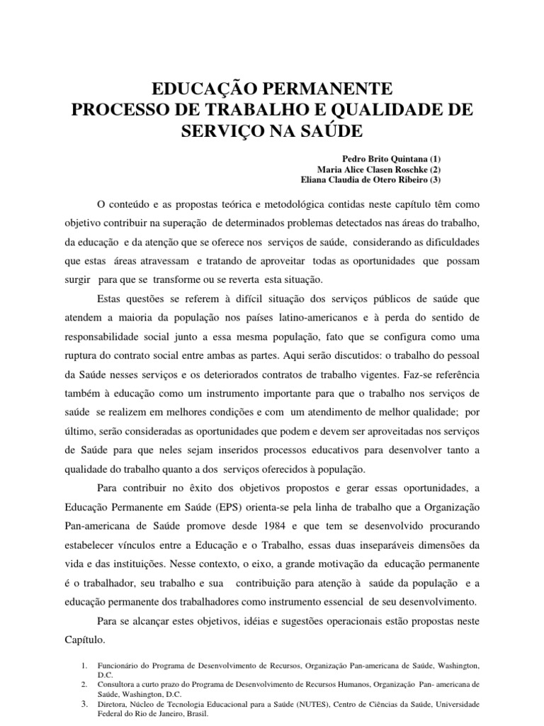 Como foi j afirmado em captulos anteriores desta obra, a dcada de 80 foi palco de um importante esforo pela insero de processos de Educao Permanente nos servios de sade em distintos pases da Regio. Essas inseres tm contado com o apoio dado pela Organizao Panamericana de Sade, assim como o de uma significativa produo, por parte de grupos profissionais latino-americanos, de aportes conceituais e metodolgicos