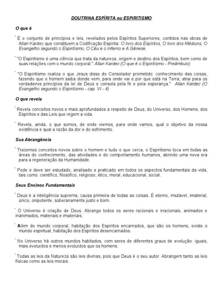 lan Kardec que constituem a Codificao Esprita: O livro dos Espritos, O livro dos Mdiuns, O Evangelho segundo o Espiritismo, O Cu e o Inferno e A Gnese. "O Espiritismo uma cincia que trata da natureza, origem e destino dos Espritos, bem como de suas relaes com o mundo corporal." Allan Kardec (O que o Espiritismo - Prembulo) "O Espiritismo realiza o que Jesus disse do Consolador prometido: conhecimento das coisas, fazendo que o homem saiba donde vem, para onde vai e por que est na Terra; atrai para os verdadeiros princpios da lei de Deus e consola pela f e pela esperana." Allan Kardec (O Evangelho segundo o Espiritismo - cap. VI - 4) O que revela Revela conceitos novos e mais aprofundados a respeito de Deus, do Universo, dos Homens, dos Espritos e das Leis que regem a vida. Revela, ainda, o que somos, de onde viemos, para onde vamos, qual o objetivo da nossa existncia e qual a razo da dor e do sofrimento. Sua Abrangncia Trazemos conceitos novos sobre o homem e tudo o que cerca, o Espiritismo toca em todas as reas do conhecimento, das atividades e do comportamento humanos, abrindo uma nova era para a regenerao da Humanidade. Pode e deve ser estudado, analisado e praticado em todos os aspectos fundamentais da vida, tais como: cientfico, filosfico, religioso, tico, moral, educacional, social. Seus Ensinos Fundamentais Deus a inteligncia suprema, causa primeira de todas as coisas. eterno, imutvel, imaterial, nico, onipotente, soberanamente justo e bom. O Universo criao de Deus. Abrange todos os seres racionais e irracionais, animados e inanimados, materiais e imateriais. Alm do mundo corporal, habitao dos Espritos encarnados, que so os homens, existe o mundo espiritual, habitao dos Espritos desencarnados. No Universo h outros mundos habitados, com seres de diferentes graus de evoluo: iguais, mais evoludos e menos evoludos que os homens. Todas as leis da Natureza so leis divinas, pois que Deus o seu autor. Abrangem tanto as leis fsicas como as leis morais.