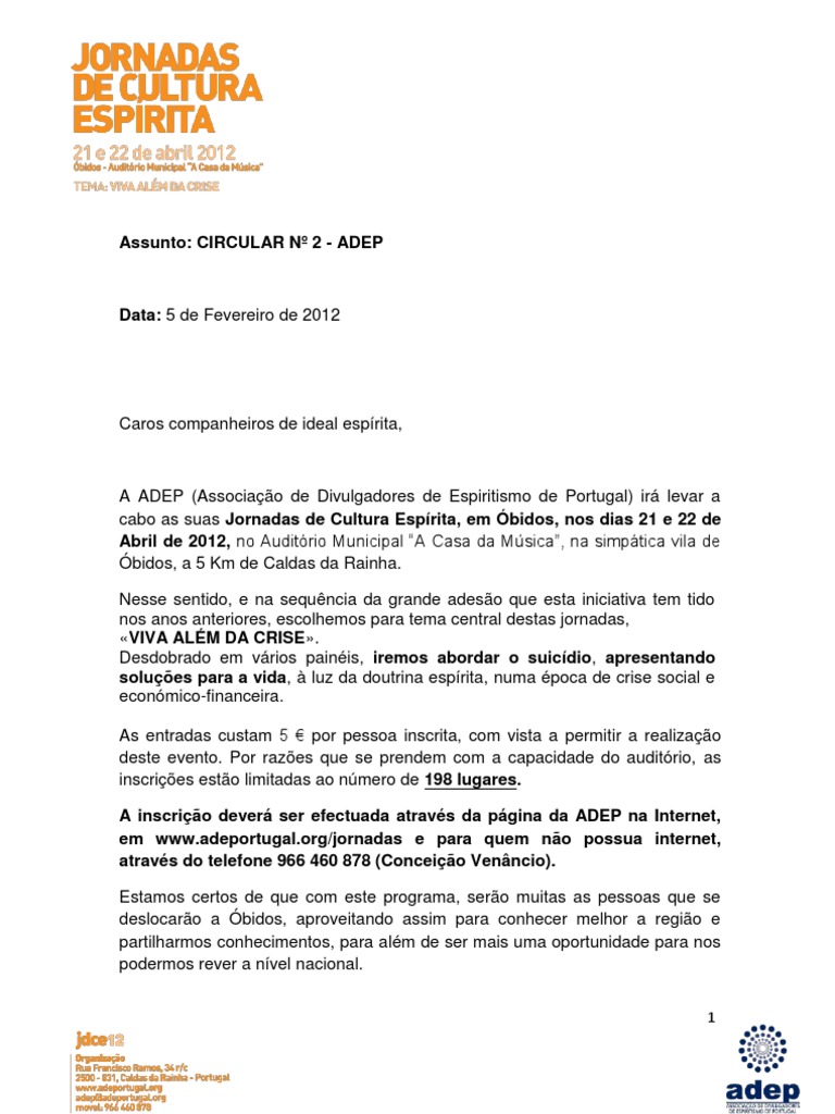 A ADEP (Associação de Divulgadores de Espiritismo de Portugal) irá levar a cabo as suas Jornadas de Cultura Espírita, em Óbidos, nos dias 21 e 22 de Abril de 2012, no Auditório Municipal “A Casa da Música”, na simpática vila de Óbidos, a 5 Km de Caldas da Rainha.