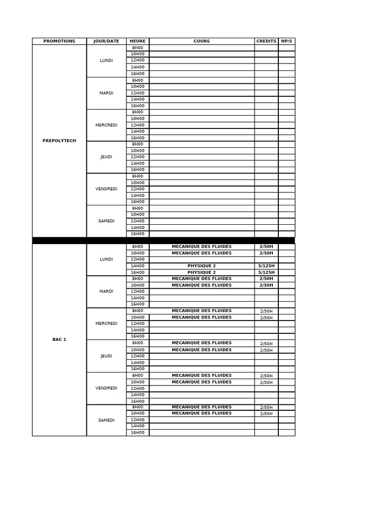 PROMOTIONS JOUR/DATE HEURE COURS CREDITS HP/S