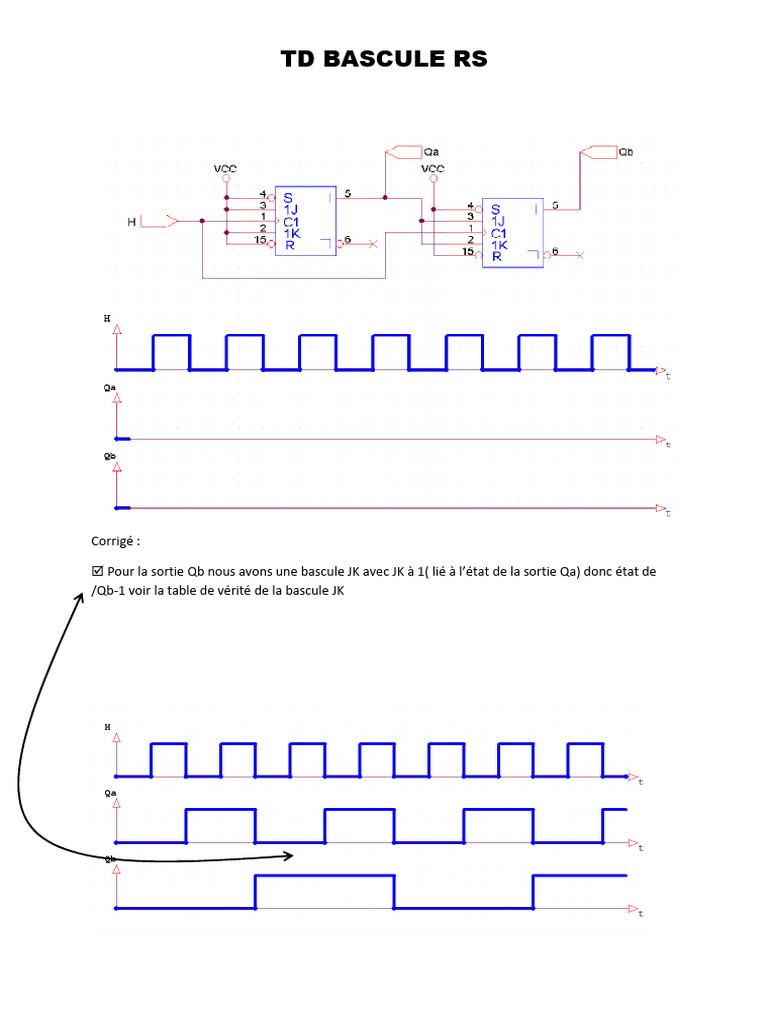 Pour la sortie Qb nous avons une bascule JK avec JK à 1( lié à l’état de la sortie Qa) donc état de