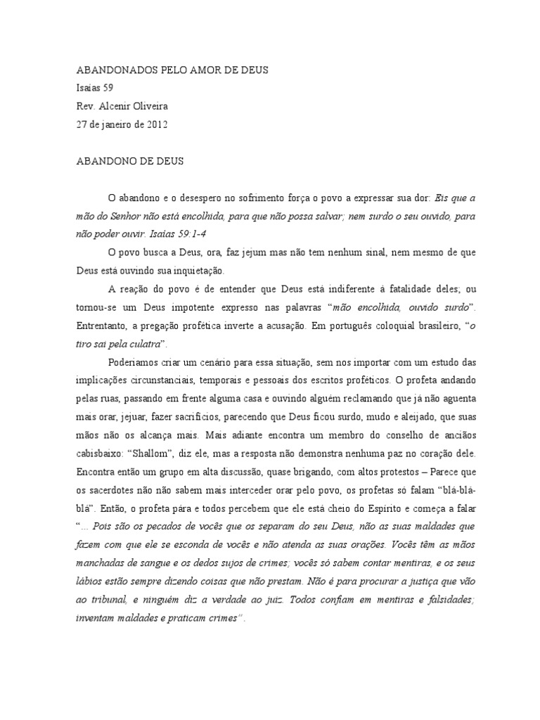 Alcenir Oliveira 27 de janeiro de 2012 ABANDONO DE DEUS O abandono e o desespero no sofrimento fora o povo a expressar sua dor: Eis que a mo do Senhor no est encolhida, para que no possa salvar; nem surdo o seu ouvido, para no poder ouvir. Isaas 59:1-4 O povo busca a Deus, ora, faz jejum mas no tem nenhum sinal, nem mesmo de que Deus est ouvindo sua inquietao. A reao do povo de entender que Deus est indiferente fatalidade deles; ou tornou-se um Deus impotente expresso nas palavras mo encolhida, ouvido surdo. Entrentanto, a pregao proftica inverte a acusao. Em portugus coloquial brasileiro, o tiro sai pela culatra. Poderiamos criar um cenrio para essa situao, sem nos importar com um estudo das implicaes circunstanciais, temporais e pessoais dos escritos profticos. O profeta andando pelas ruas, passando em frente alguma casa e ouvindo algum reclamando que j no aguenta mais orar, jejuar, fazer sacrifcios, parecendo que Deus ficou surdo, mudo e aleijado, que suas mos no os alcana mais. Mais adiante encontra um membro do conselho de ancios cabisbaixo: Shallom, diz ele, mas a resposta no demonstra nenhuma paz no corao dele. Encontra ento um grupo em alta discusso, quase brigando, com altos protestos Parece que os sacerdotes no no sabem mais interceder orar pelo povo, os profetas s falam bl-blbl. Ento, o profeta pra e todos percebem que ele est cheio do Esprito e comea a falar ... Pois so os pecados de vocs que os separam do seu Deus, no as suas maldades que fazem com que ele se esconda de vocs e no atenda as suas oraes. Vocs tm as mos manchadas de sangue e os dedos sujos de crimes; vocs s sabem contar mentiras, e os seus lbios esto sempre dizendo coisas que no prestam. No para procurar a justia que vo ao tribunal, e ningum diz a verdade ao juiz. Todos confiam em mentiras e falsidades; inventam maldades e praticam crimes.