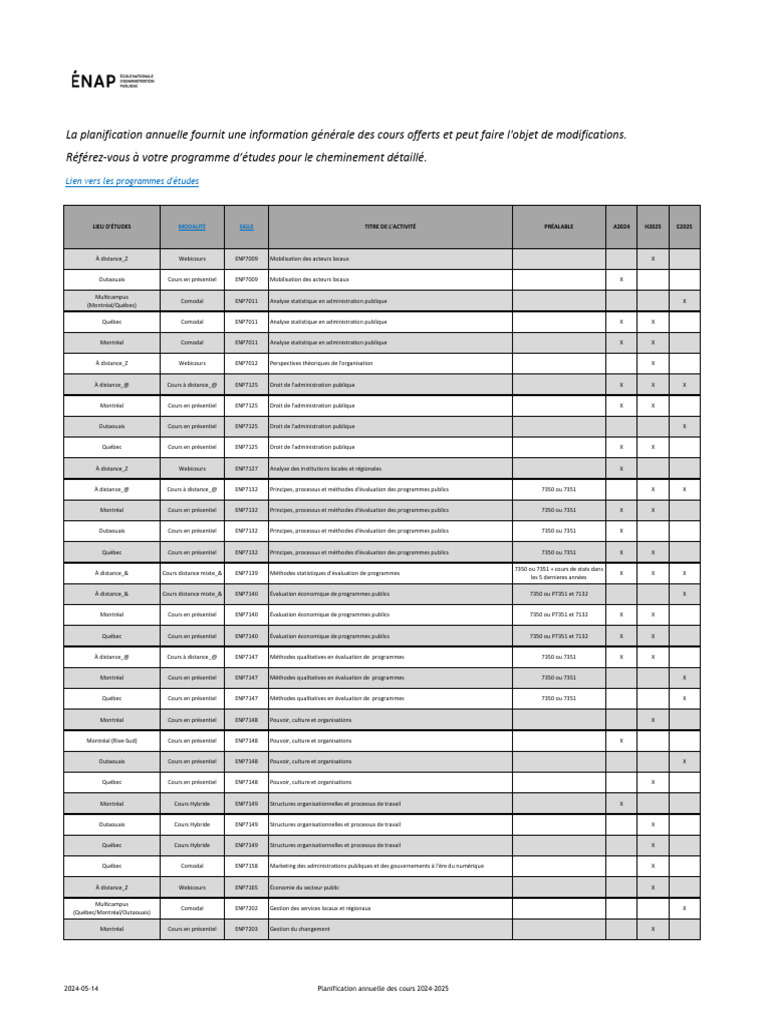 Québec Cours en présentiel ENP7132 Principes, processus et méthodes d'évaluation des programmes publics 7350 ou 7351 X X