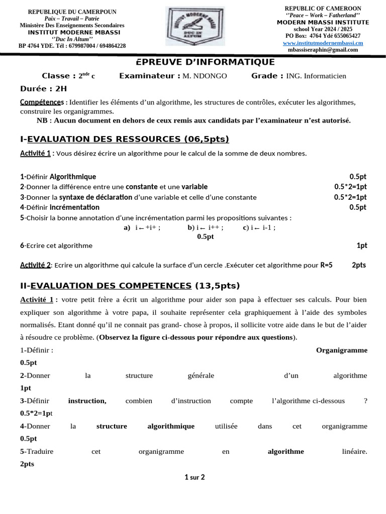 Classe : 2nde c Examinateur : M. NDONGO Grade : ING. Informaticien