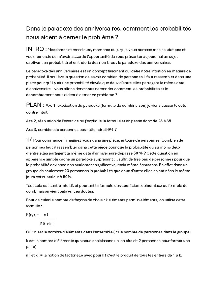 PLAN : Axe 1, explication du paradoxe (formule de combinaison) je viens casser le coté