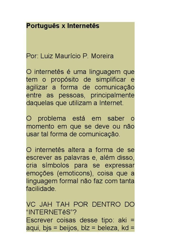 Por: Luiz Maurcio P. Moreira O internets uma linguagem que tem o propsito de simplificar e agilizar a forma de comunicao entre as pessoas, principalmente daquelas que utilizam a Internet. O problema est em saber o momento em que se deve ou no usar tal forma de comunicao. O internets altera a forma de se escrever as palavras e, alm disso, cria smbolos para se expressar emoes (emoticons), coisa que a linguagem formal no faz com tanta facilidade. VC JAH TAH POR DENTRO DO INTERNETS? Escrever coisas desse tipo: aki = aqui, bjs = beijos, blz = beleza, kd =