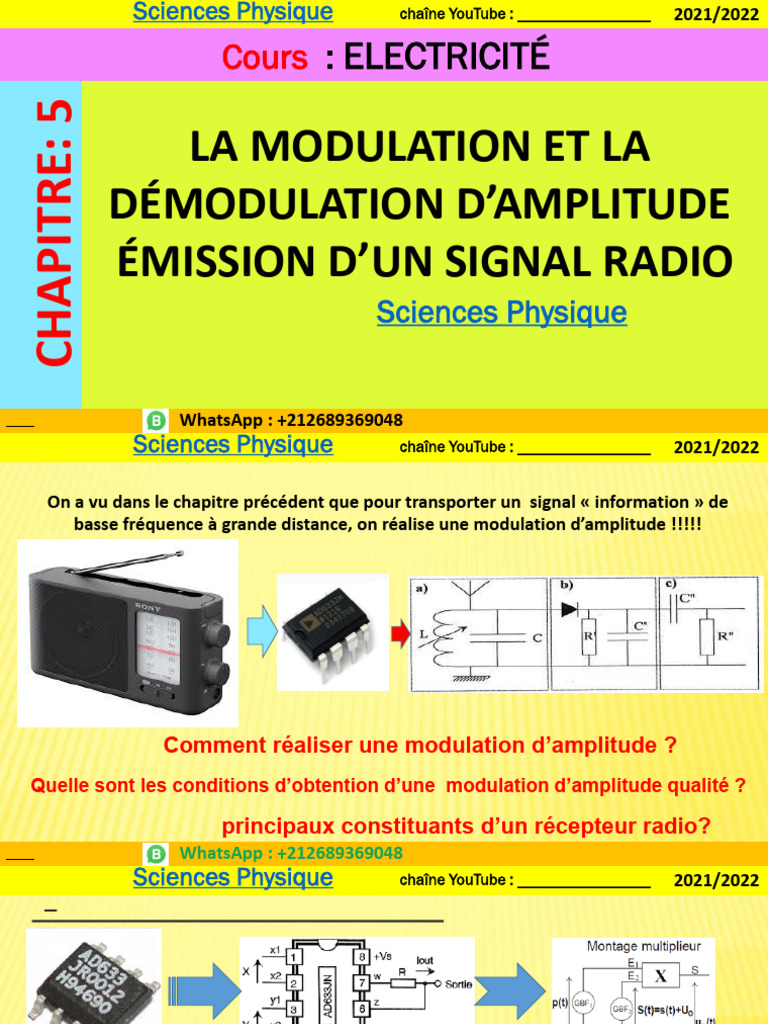 La modulation par amplitude : 𝐔𝐒 𝐭 = 𝑨. 𝐦. 𝐜𝐨 𝐬 𝟐. 𝝅. 𝒇𝑺 . 𝒕 + 𝟏 . 𝐜𝐨𝐬(𝟐. 𝝅. 𝑭𝑷 . 𝒕)