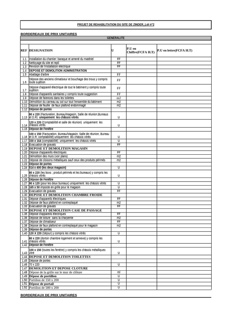 REF DESIGNATION U P.U en lettre(FCFA H.T)