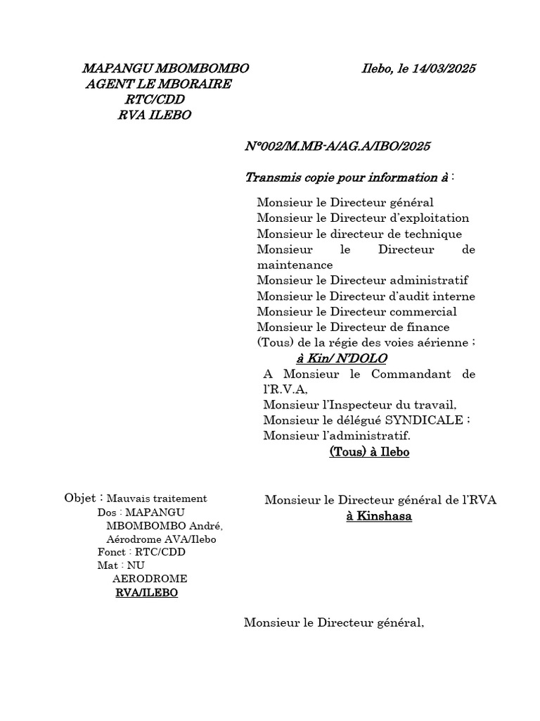 Objet : Mauvais traitement Monsieur le Directeur général de l’RVA