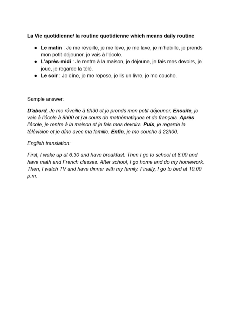 La Vie quotidienne/ la routine quotidienne which means daily routine