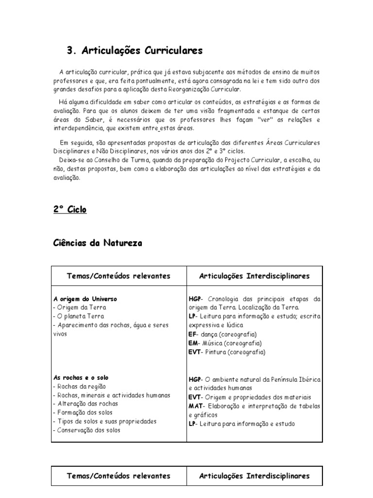 A articulao curricular, prtica que j estava subjacente aos mtodos de ensino de muitos professores e que, era feita pontualmente, est agora consagrada na lei e tem sido outro dos grandes desafios para a aplicao desta Reorganizao Curricular. H alguma dificuldade em saber como articular os contedos, as estratgias e as formas de avaliao. Para que os alunos deixem de ter uma viso fragmentada e estanque de certas reas do Saber, necessrios que os professores lhes faam "ver" as relaes e interdependncia, que existem entre estas reas. Em seguida, so apresentadas propostas de articulao das diferentes reas Curriculares Disciplinares e No Disciplinares, nos vrios anos dos 2 e 3 ciclos. Deixa-se ao Conselho de Turma, quando da preparao do Projecto Curricular, a escolha, ou no, destas propostas, bem como a elaborao das articulaes ao nvel das estratgias e da avaliao.