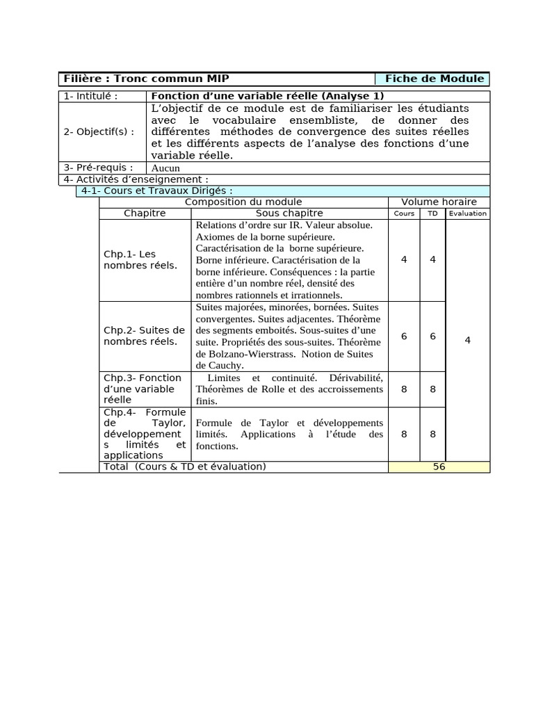 1- Intitulé : Fonction d’une variable réelle (Analyse 1)