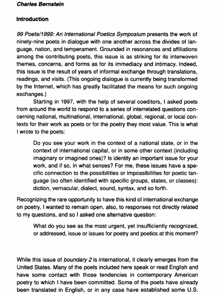 have asked the editors of boundary 2 to bear with these poetic texts, leav-