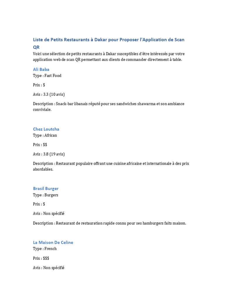 Liste de Petits Restaurants à Dakar pour Proposer l'Application de Scan
