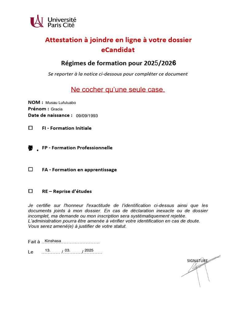 Attestation à joindre en ligne à votre dossier