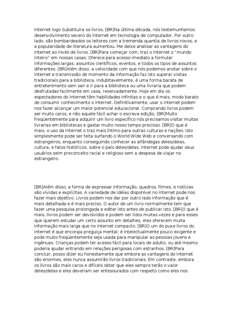 [BR]Alm disso, a forma de expressar informao, quadros, filmes, e notcias so vvidas e explcitas. A variedade de idias disponvel no internet pode nos fazer mais objetivo. Livros podem nos dar por outro lado informao que mais detalhada e mais preciso. O autor de um livro normalmente tem que fazer uma pesquisa prolongada e editar isto antes de publicar isto. [BR]O que mais, livros podem ser devolvidos e podem ser lidos muitas vezes e para esses que querem estudar um certo assunto em detalhes, eles oferecem muita informao mais larga que no internet compacto. [BR]O um do puxe livros do internet que encoraja preguia mental; intelectualmente pouco exigente e pode muito freqentemente seja usada para manipular as pessoas jovens e ingnuas. Crianas podem ter acesso fcil para locais de adulto, ou at mesmo poderia ajudar entrando em relaes perigosas com estranhos. [BR]Para concluir, posso dizer eu honestamente que embora as vantagens do internet so enormes, eles nunca assumiro livros tradicionais. Em contraste, embora os livros so mais caros e difceis obter que eles sempre tero o valor deles/delas e eles deveriam ser entesourados com respeito como eles nos