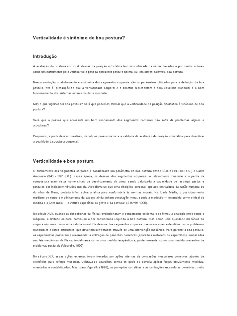 A avaliao da postura corporal atravs da posio ortosttica tem sido utilizada h vrias dcadas e por muitos autores como um instrumento para verificar se a pessoa apresenta postura normal ou, em outras palavras, boa postura. Nessa avaliao, o alinhamento e a simetria dos segmentos corporais so os parmetros utilizados para a definio da boa postura, isto , pressupe-se que a verticalidade corporal e a simetria representam o bom equilbrio muscular e o bom funcionamento dos sistemas steo-articular e muscular. Mas o que significa ter boa postura? Ser que podemos afirmar que a verticalidade na posio ortosttica sinnimo de boa postura? Ser que a pessoa que apresenta um bom alinhamento dos segmentos corporais no sofre de problemas lgicos e articulares? Propomos, a partir dessas questes, discutir os pressupostos e a validade da avaliao da posio ortosttica para classificar a qualidade da postura corporal.