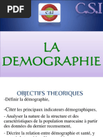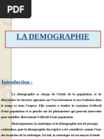 Dmographie est un mot grec qui vient de demos cest dire peuple, et graphie . La dmographie traite de la composition des groupes humains et les causes et les influences des variations de la population. Cest donc ltude de la population humaine sous laspect quantitatif et qualitatif. - La dmographie qualitative traite la population humaine comme un ensemble. Elle suit sa dimension, sa structure et son volution. Elle se base sur la statistique et ses mthodes dans le but dobtenir correctement les donnes et puis de les interprter. - La dmographie quantitative porte sur ltude des mouvements qui se produisent dans les populations, ainsi que sur les divers facteurs agissants. Le nombre de la population dpend des naissances, des dcs. Aussi il augmente par limmigration et diminue par lmigration. Pt0 : population actuelle Pt : Pt0 + naissance dcs + immigrations migrations Ainsi la population humaine est en perptuel mouvement, et on a cherch depuis des sicles tablir des systmes de statistique, pour enregistrer les mariages, les naissances, les dcs et les migrations. Certains pays industrialiss disposent de donnes dmographiques depuis des sicles, en stant intresser au dbut des objectifs militaires et fiscaux. Alors que dans les pays en voie de dveloppement, les recensements sont confronts quelques obstacles. La dmographie se base sur deux principales catgories qui sont en ralit complmentaires : - 1re catgorie : on cherche particulirement le volume de la population (le nombre), sa structure (comme la rpartition par sexe ou par ge), sa rpartition gographique et sa rpartition par catgorie socioprofessionnelle. - 2me catgorie : o len sintresse au mouvement de la population, travers lenregistrement qui contient des naissances, des dcs et des migrations. Population inactive * jeunes inactifs (enfants, coliers, tudiants, formations professionnelles). * Retraits et les femmes au foyer. * Grands malades, handicaps, vieillards, rentiers * Autres inactifs (dclaration). * Actifs occups (ceux qui travaillent). * Chmeurs (ceux qui ont dj travaill et ceux qui nont jamais travaill).