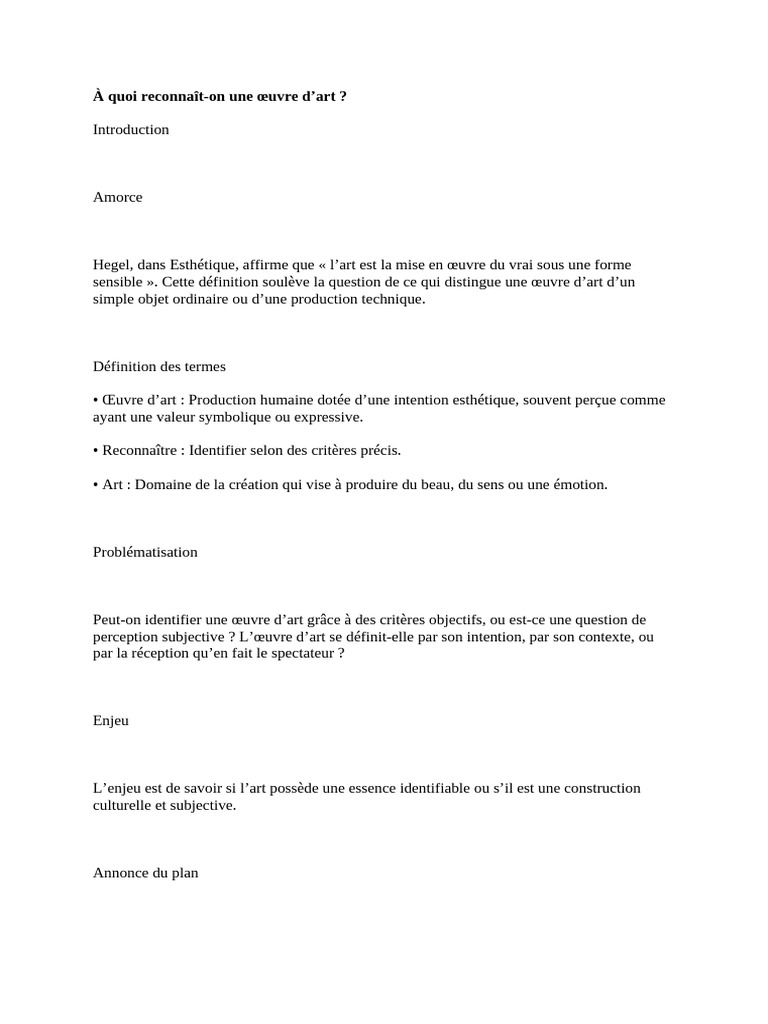 • Synthèse : L’œuvre d’art se reconnaît d’abord par des critères objectifs (intention, beauté,