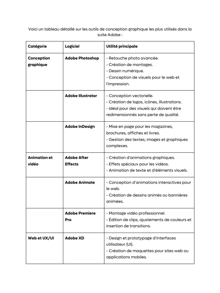 Voici un tableau détaillé sur les outils de conception graphique les plus utilisés dans la