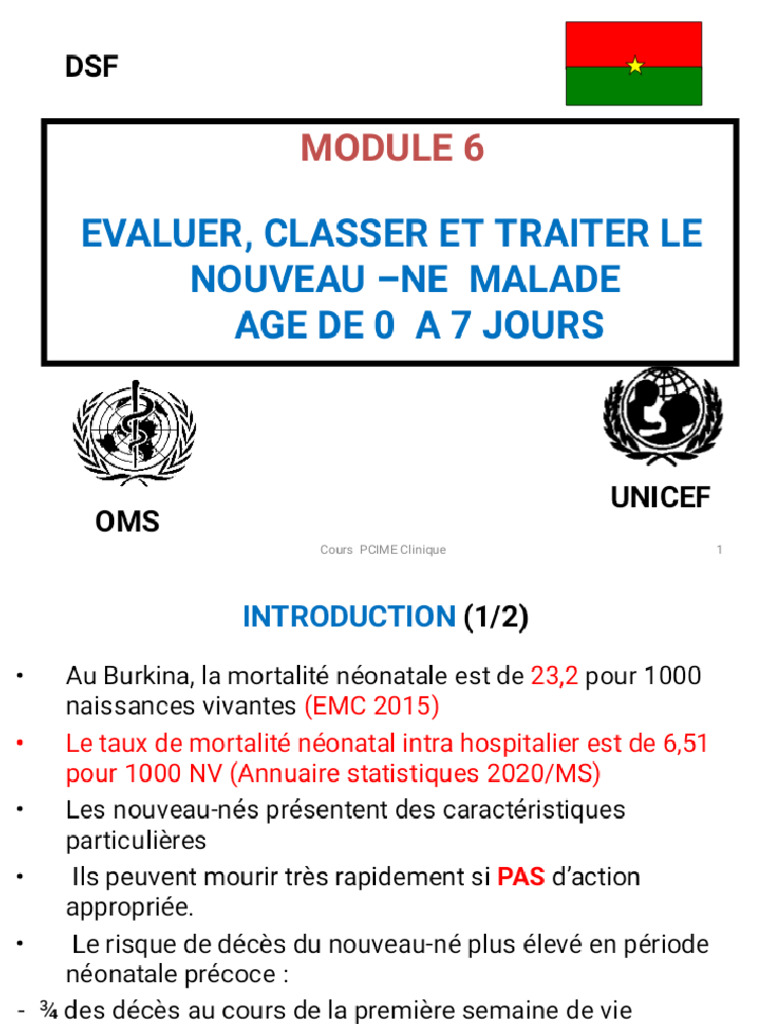Le module traite de l'évaluation, du classement et du traitement des nouveau-nés malades âgés de 0 à 7 jours, soulignant l'importance de la prise en charge intégrée pour réduire la mortalité néonatale au Burkina. Il décrit les étapes d'évaluation, de classification et de traitement, ainsi que les signes d'alerte pour les infections graves et les maladies. Les recommandations incluent le transfert d'urgence vers un hôpital si nécessaire, ainsi que des conseils pour le suivi des soins à domicile.