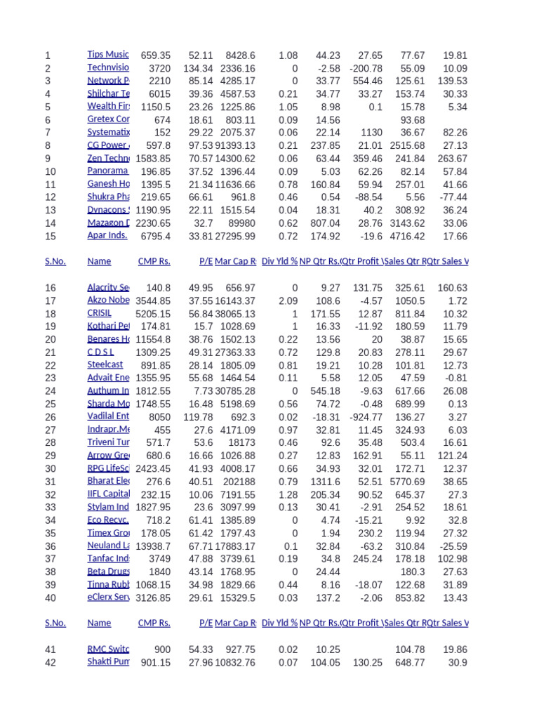 70 Pudumjee Paper 129.1 10.76 1225.8 0.47 19.58 -38.54 193.69 -4.92